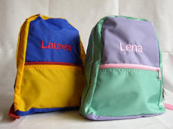 These personalized Mini-Backpacks are made of durable nylon. Measuring 11 1/2" x 8" x 4" they are perfect for a trip to Grandma's or Preschool. They are avalible in Red/Blue/Gold or Pink/Purple/Mint Green.